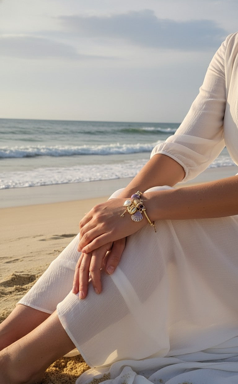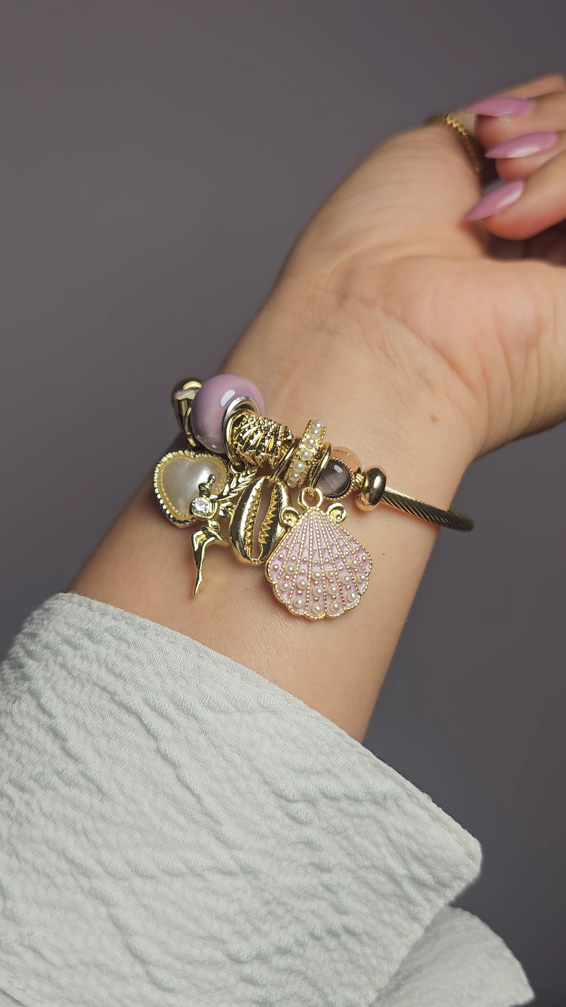 | A dreamy Pandora-style bracelet adorned with a pearl heart, lilac beads, a fairy charm, and seashell accents—perfect for a soft, magical aesthetic. |